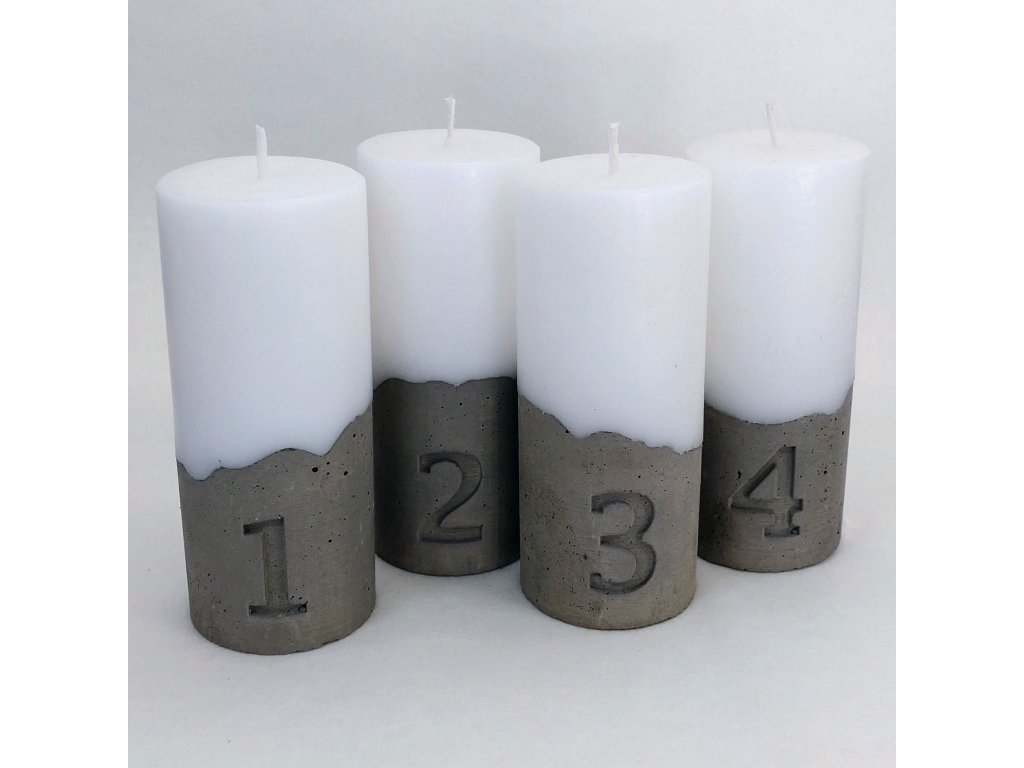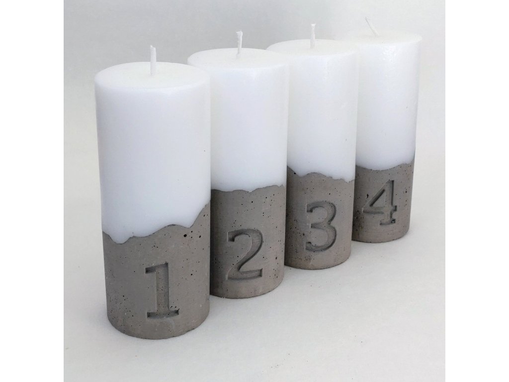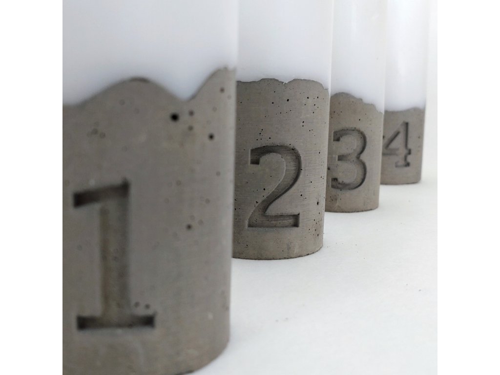 Designová sada adventních svíček s betonovou základnou a čísly 1–4.