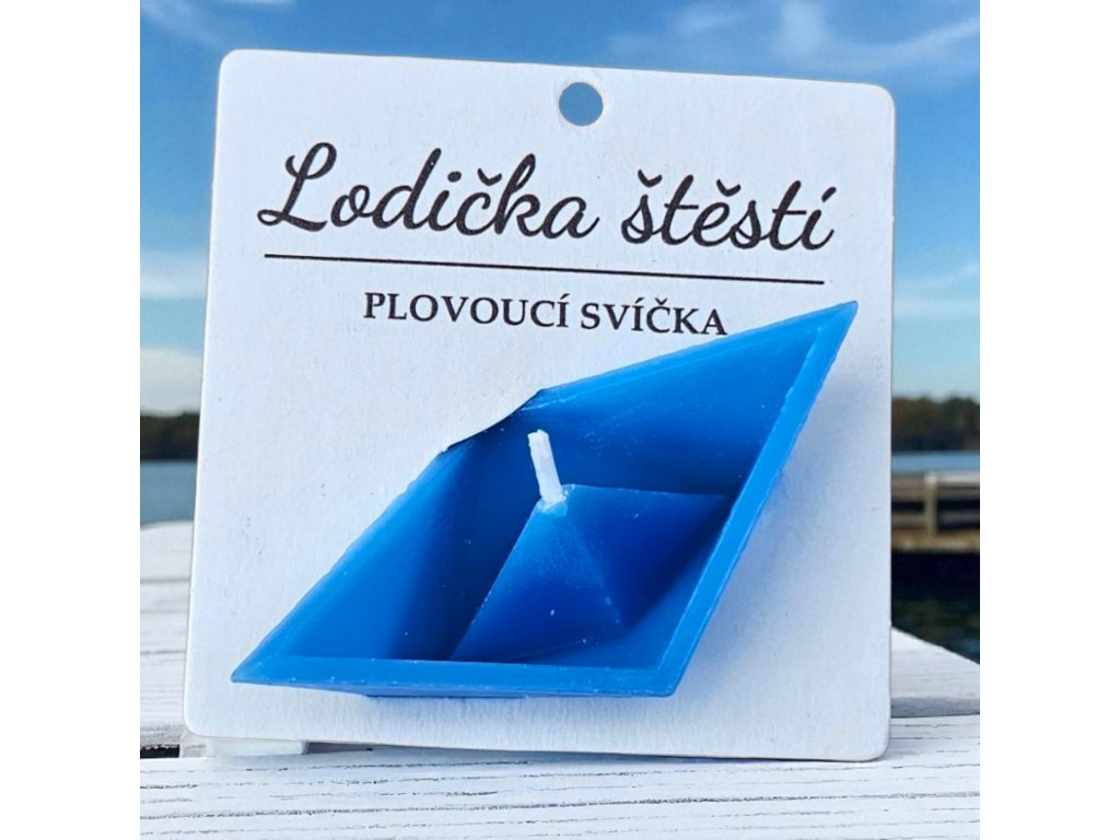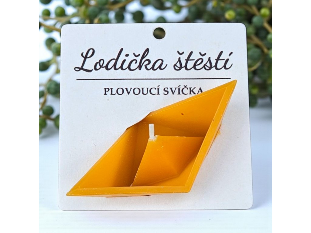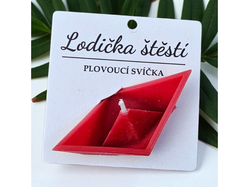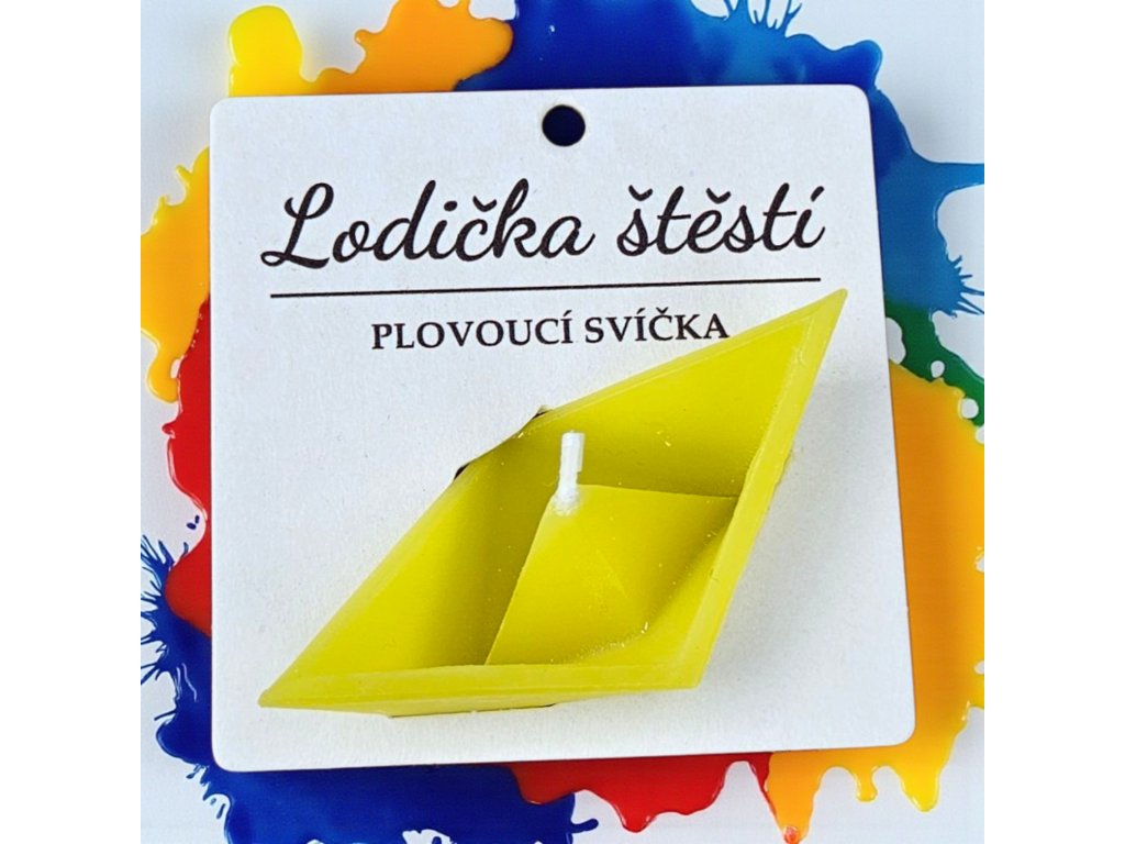 Malá plovoucí svíčka "LODIČKA ŠTĚSTÍ" která je posazena do papírové kartičky. Na kartičce je v tomto případě nápis "Lodička štěstí - plovoucí svíčka".