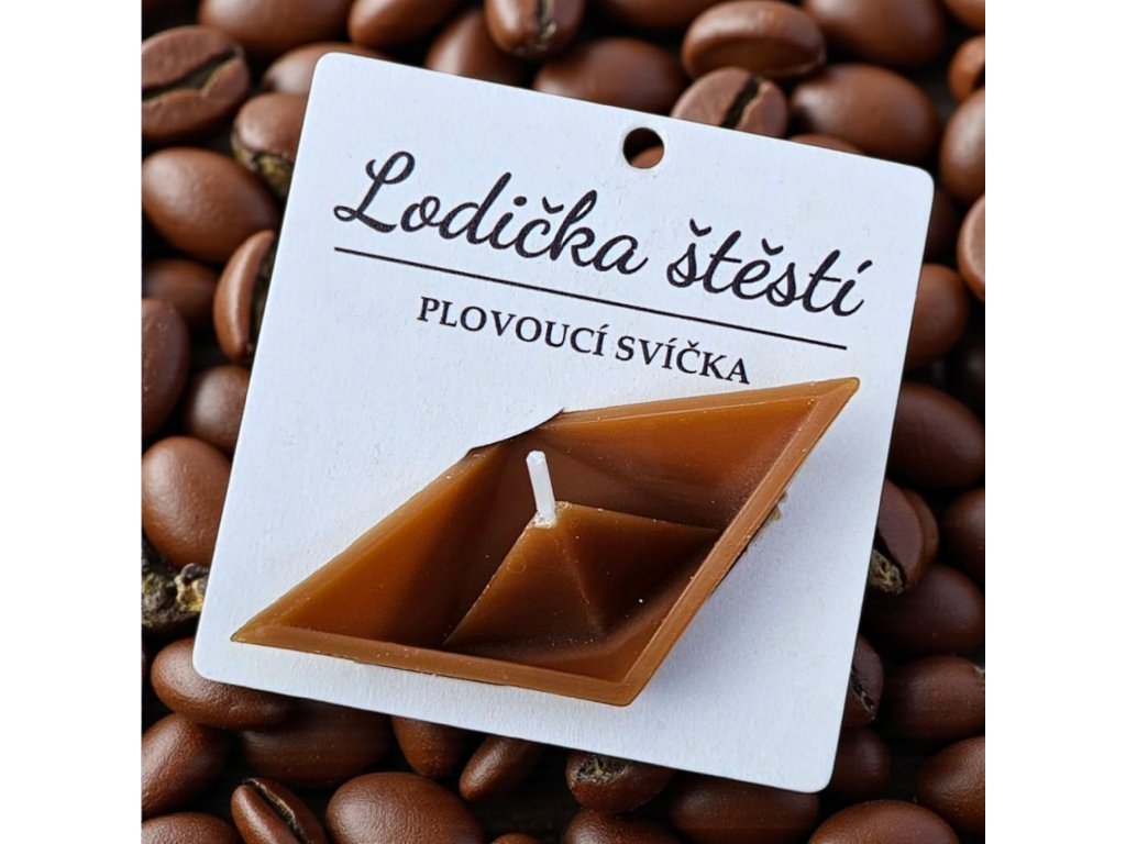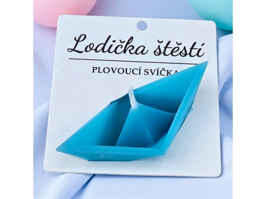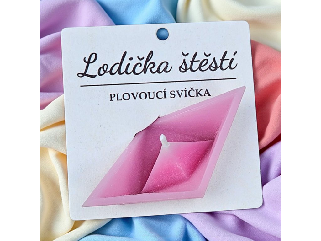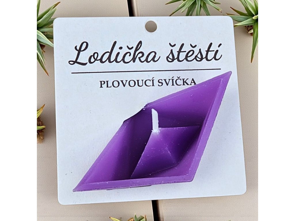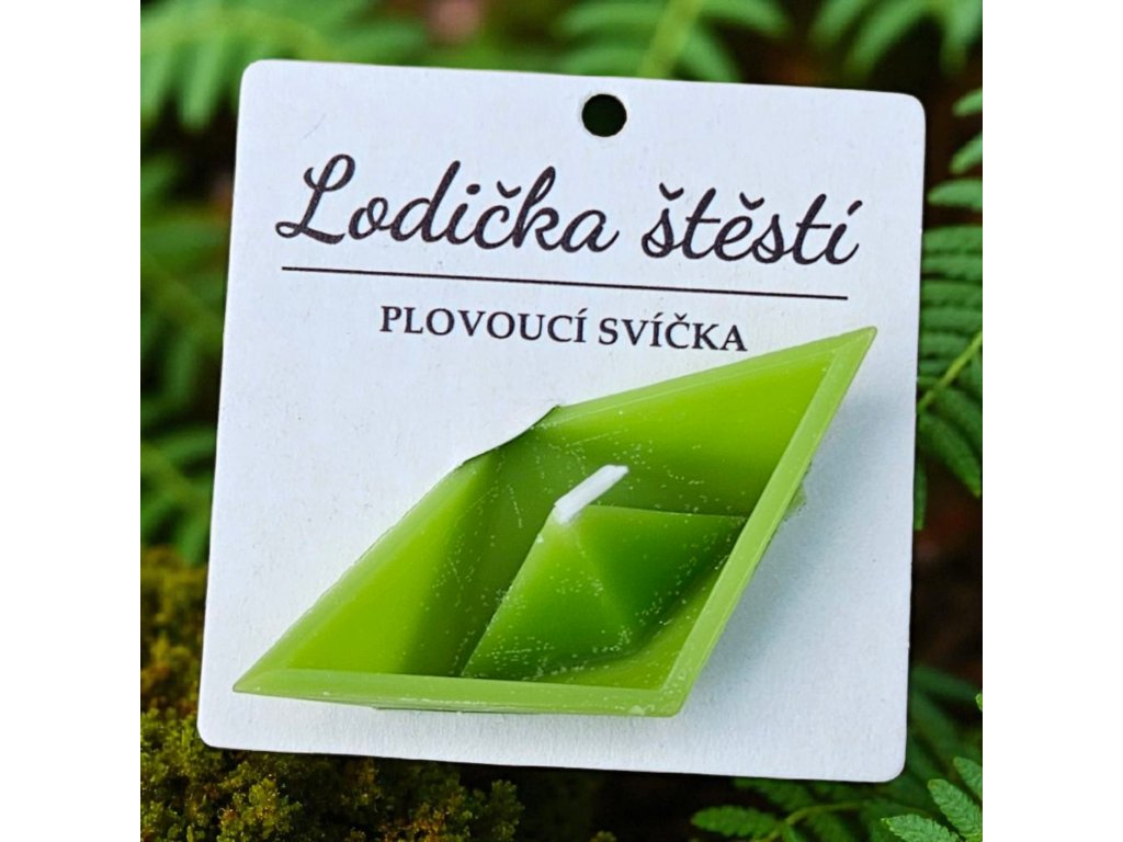 Malá plovoucí svíčka "LODIČKA ŠTĚSTÍ" která je posazena do papírové kartičky. Na kartičce je v tomto případě nápis "Lodička štěstí - plovoucí svíčka".