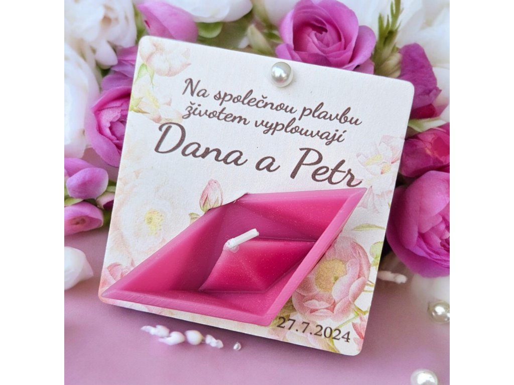Malá plovoucí svíčka "LODIČKA ŠTĚSTÍ" která je posazena do papírové kartičky. Na svatebním stole může být jako originální jmenovka , která se pro svatebčany stane milým dárečkem. Lodička v kartičce však může být i nevšední pozvánkou na Váš velký den.