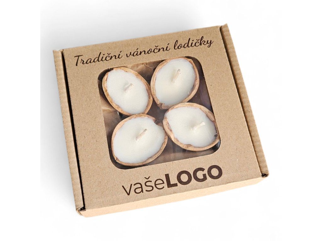 Reklamní sada tradičních vánočních lodiček je balena v přírodní krabičce s vaším vlastním potiskem – logem, textem nebo přáním. Každé balení obsahuje 4 skořápky opatřené knotem a zalité přírodním sójovým voskem, připravené k okamžitému použití.